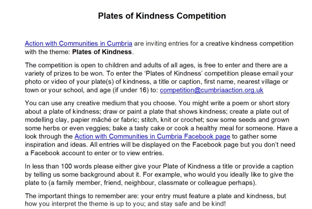Action with Communities in Cumbria have a competition open for all SJB children and adults to enter. Based around designing a Plate of Kindness, entries will be judged in the following categories: under 4s, under 7s, under 11s, under 16s and 16 and overs. The closing date for the competition is Friday 3rd July. See full details below on how to enter.