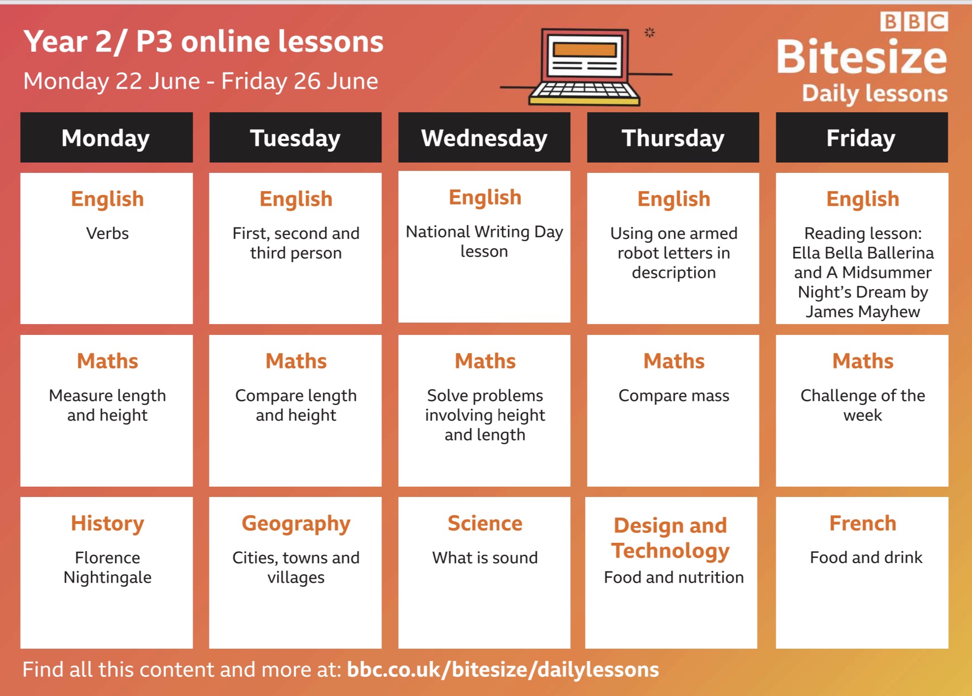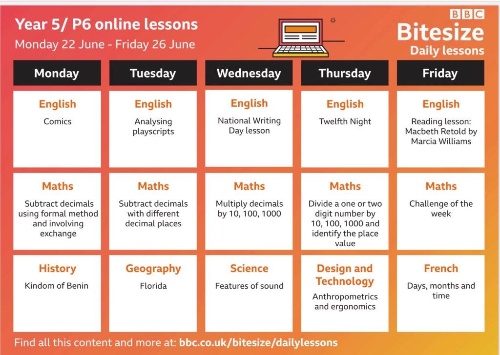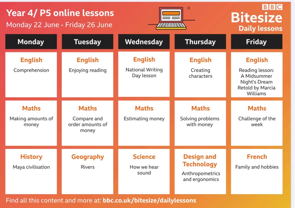 Below is a link to the schedule for the week ahead on BBC Bitesize. There are stories from Shakespeare to enjoy and science lessons about sound. https://www.bbc.co.uk/teach/bitesize-daily-lessons-schedule/zdtwjhv