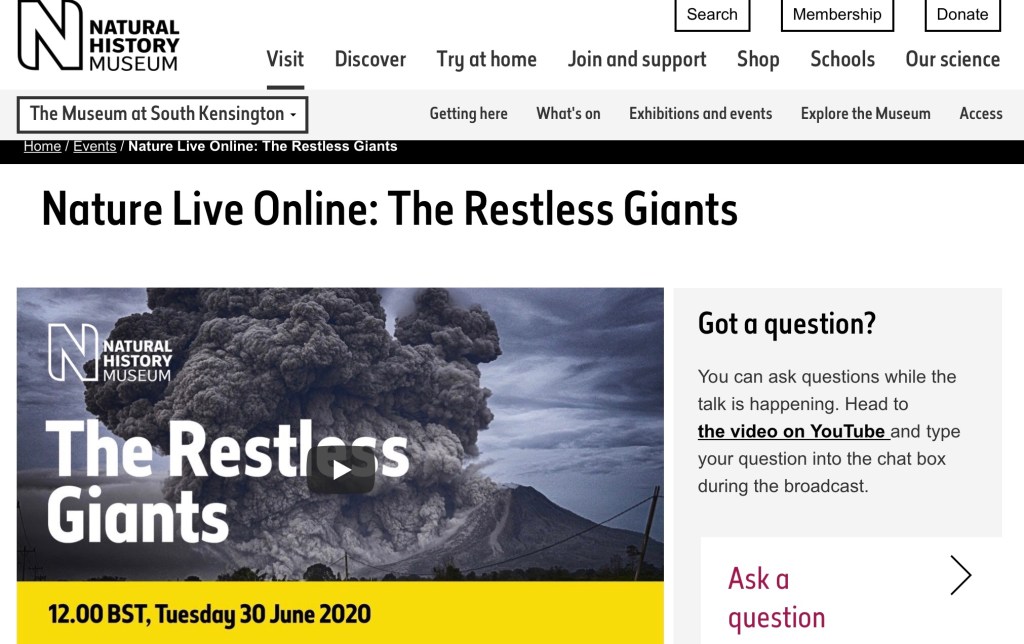 The Natural History Museum are offering live lessons. Today at 12 noon enjoy a talk about volcanoes. https://www.nhm.ac.uk/events/nature-live-online-restless-giants.html