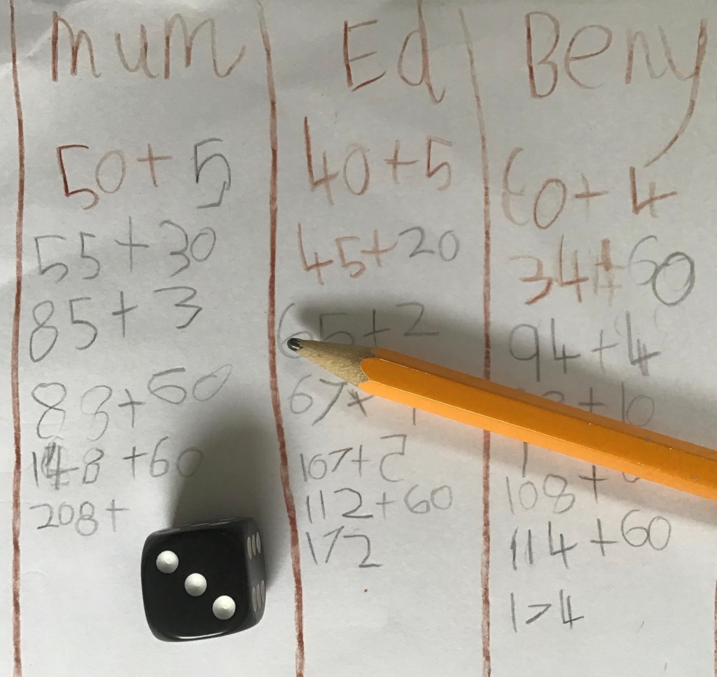 All you need to play this game is a dice, pencil and paper. The aim of the game is to use your adding and times table skills to race to 100 or more if you want a challenge! On the first roll of the dice, multiple the number by 10. Everyone takes one turn at a time, but for each round you all decide whether you simply add the number on the dice in ones or multiply by ten until you get to 100. For a more difficult version of the game use harder times tables like 2s, 3s or 7s and race to 200!