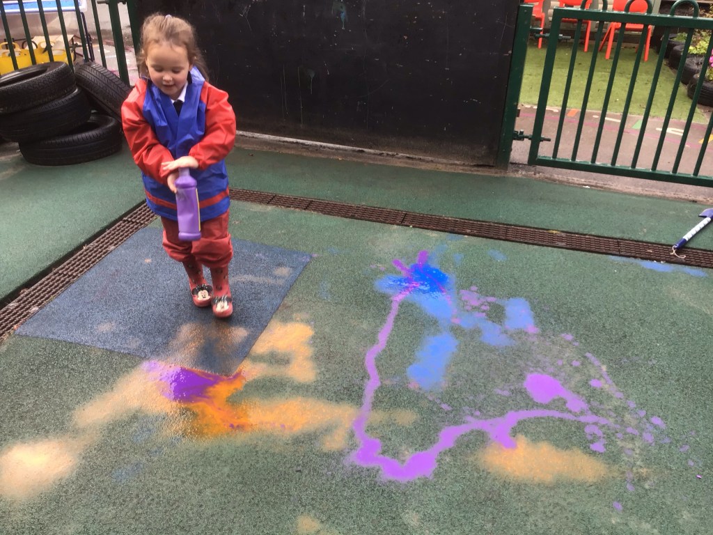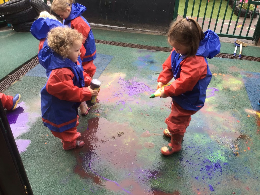 A little bit of rain wonβt stop play in Nursery so the children got themselves kitted up in waterproofs and explored colours by squirting diluted paint into the puddles. It made a wonderful mix of rainbow colours ππ§βοΈ