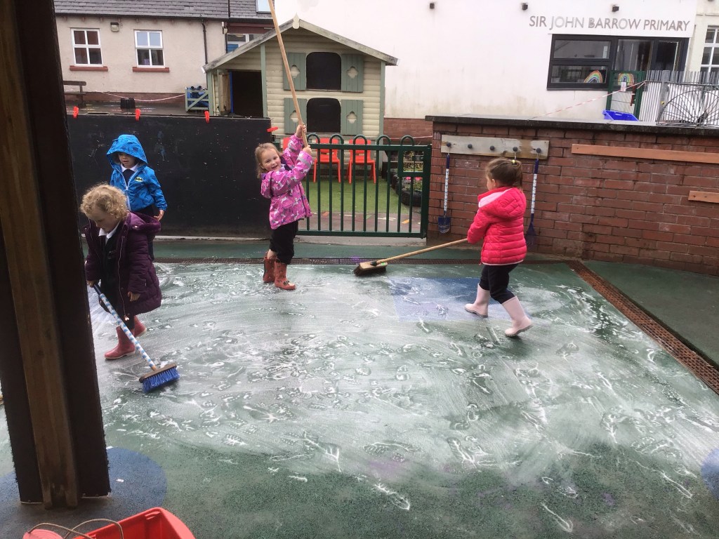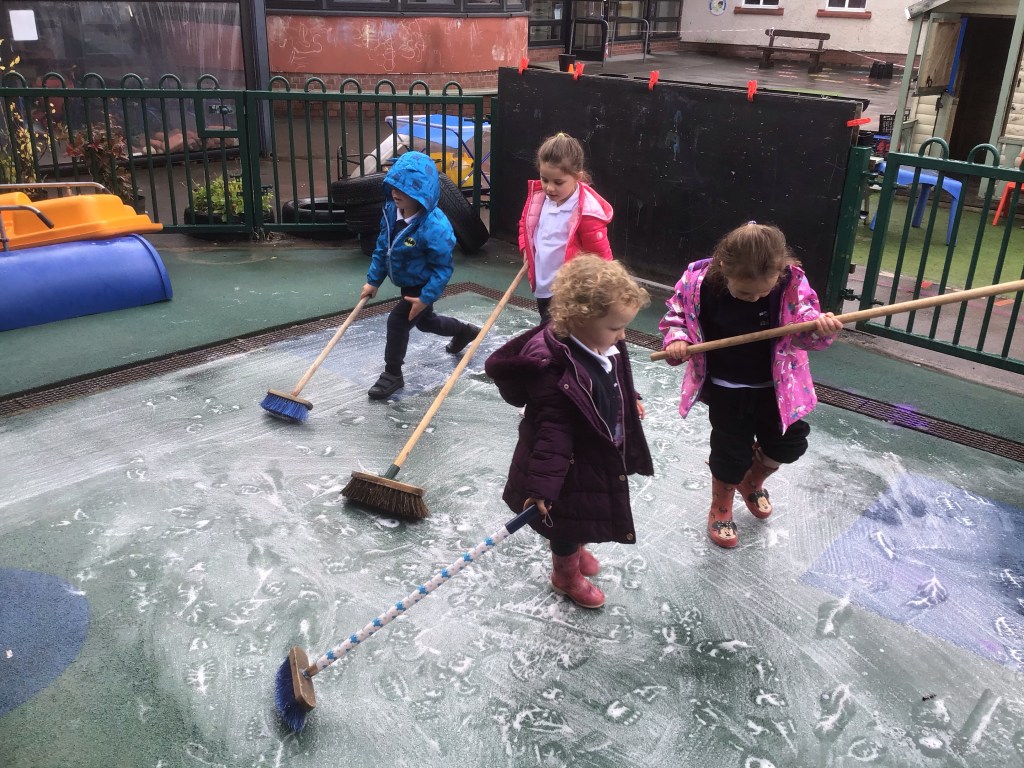 Of course, then we had to have the big clear up with soapy water. The children had loads of fun with all the bubbles and also strengthened their core muscles ready for writing too!