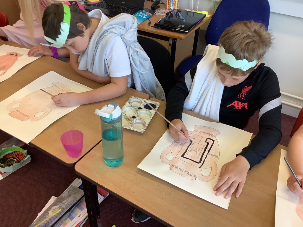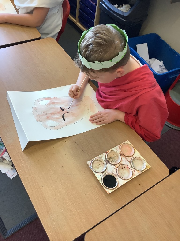 To celebrate the end of the topic we had an Ancient Greek themed day. We all dressed up in robes, we had a feast trying Greek food ( we were not too keen on olives as you’ll see by the photos!), painted vases and competed in the Olympics for our city-states.
