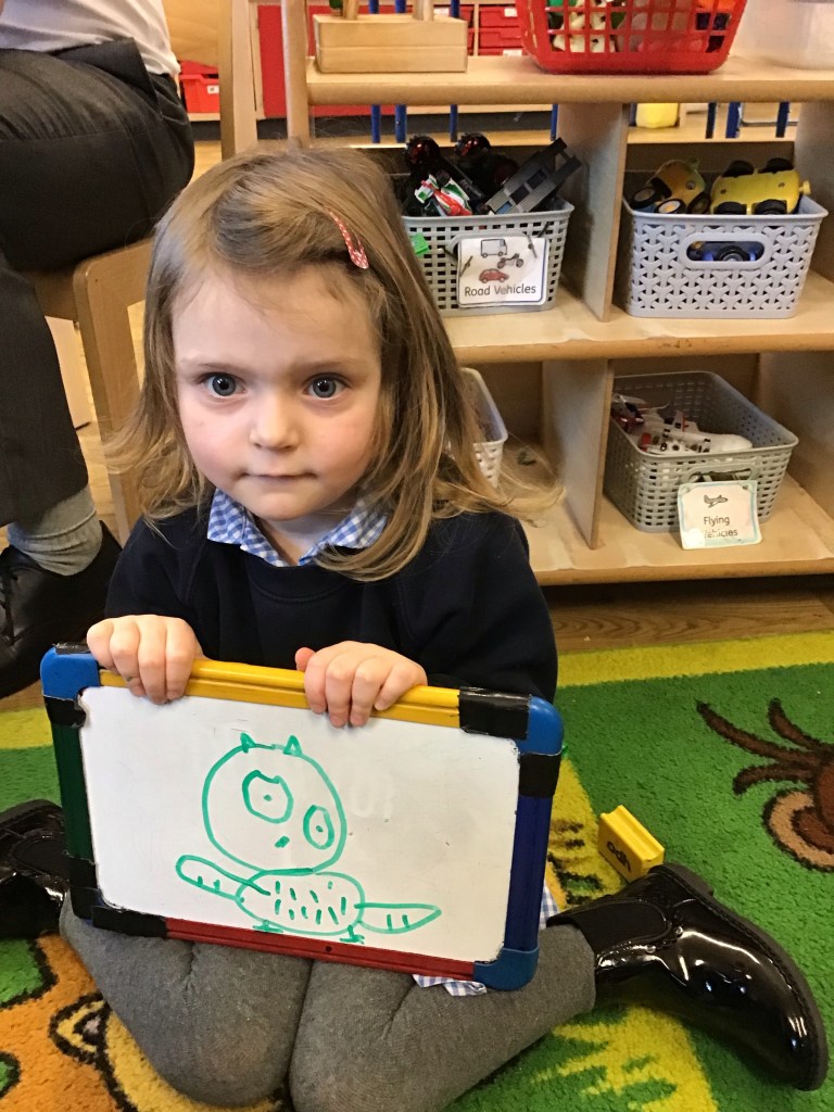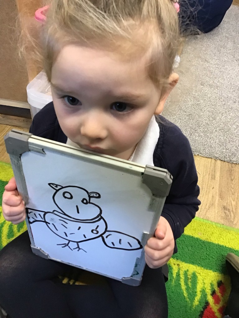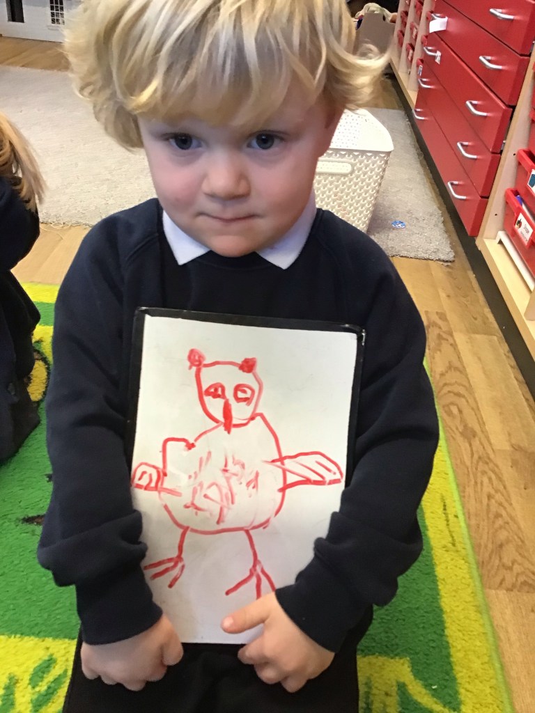 In Nursery, we have been looking at animals who live in cold places. We decided to draw an owl. We had to think about circle shapes for the eyes and head and then we talked about the texture of the feathers on the owl’s body and made gentle marks with our pens to represent them. The children drew some amazing pictures. 🦉🌟