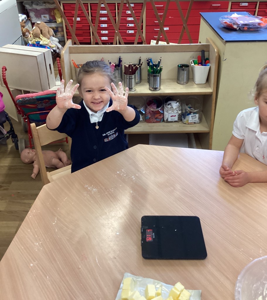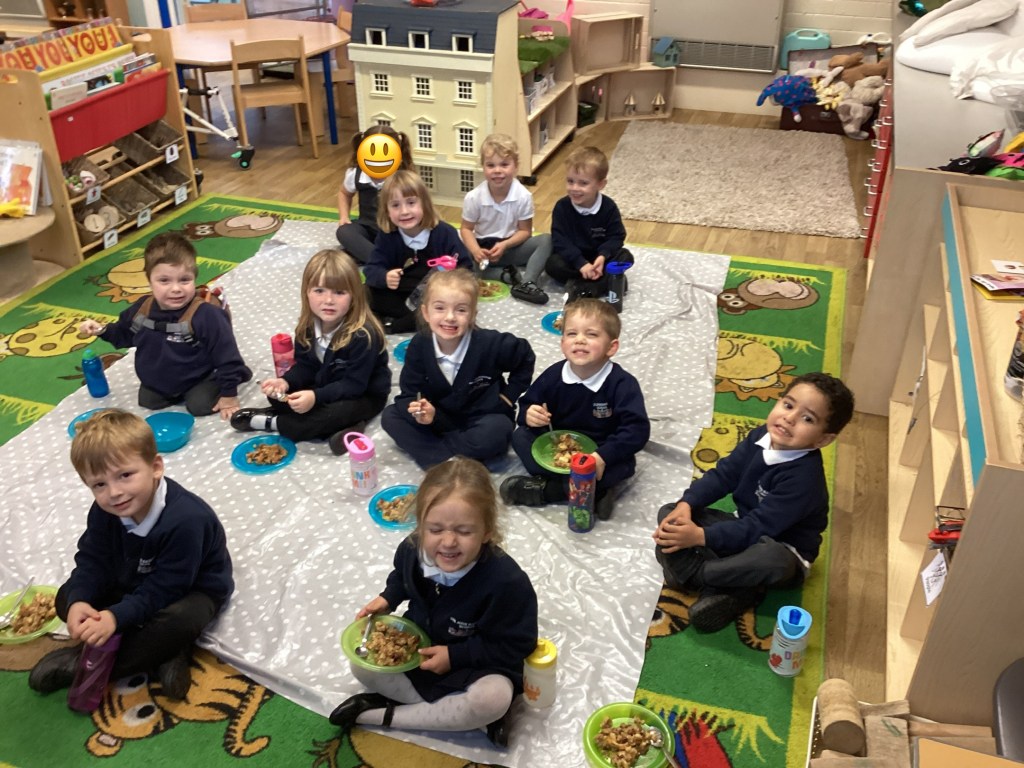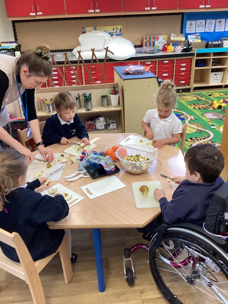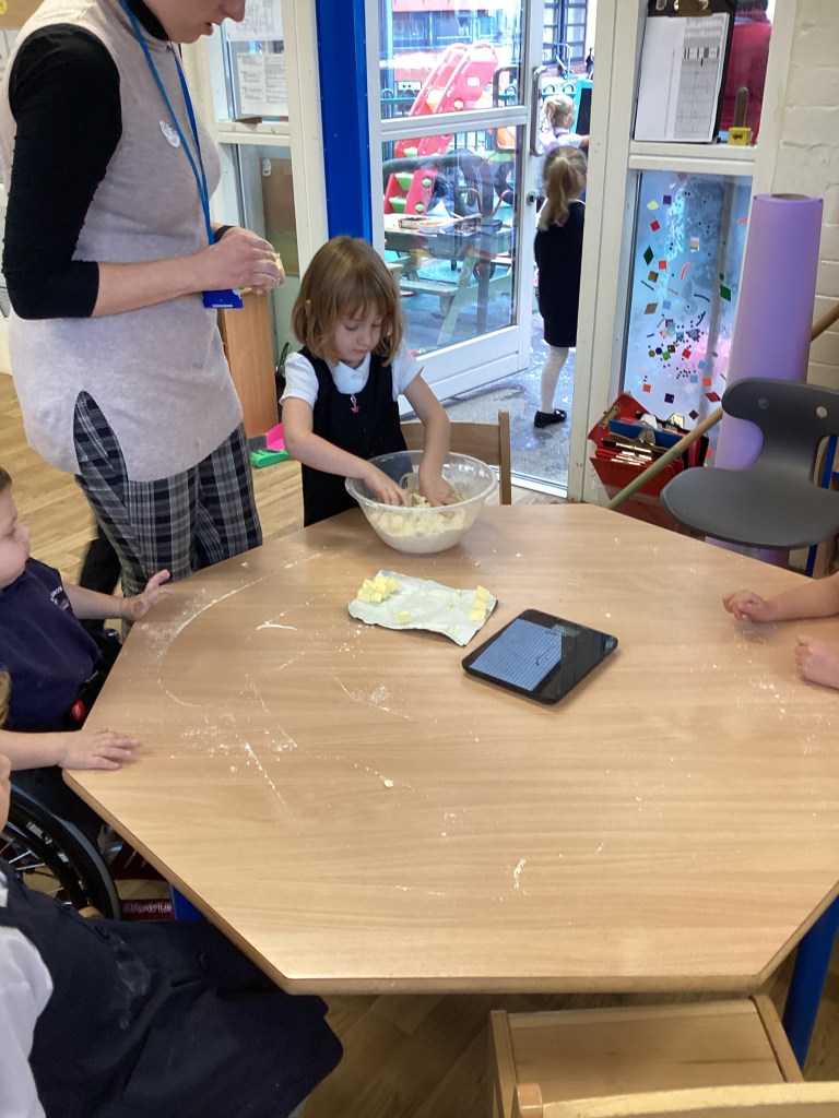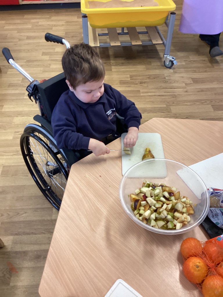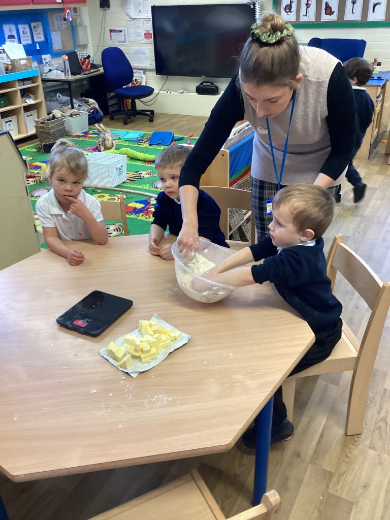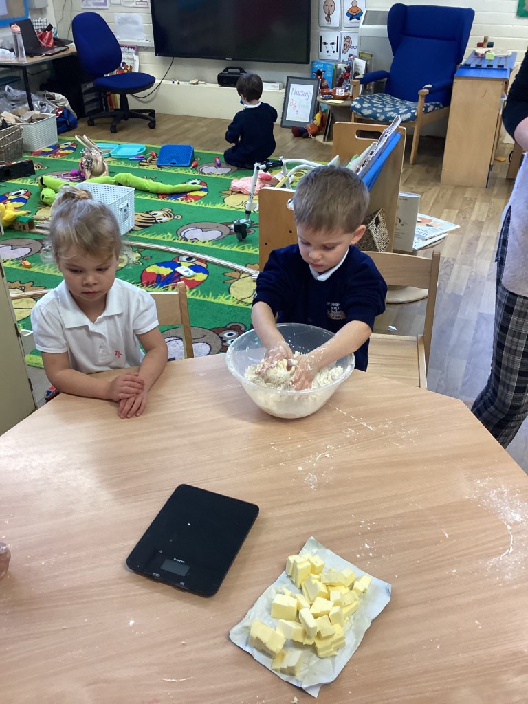 In the week leading up to half term, Nursery enjoyed making Gruffalo crumble. We started by peeling and chopping the fruit. Then we weighed the flour, sugar and butter to make the crumble. The delicious smell that came from the oven made our tummies rumble all morning.