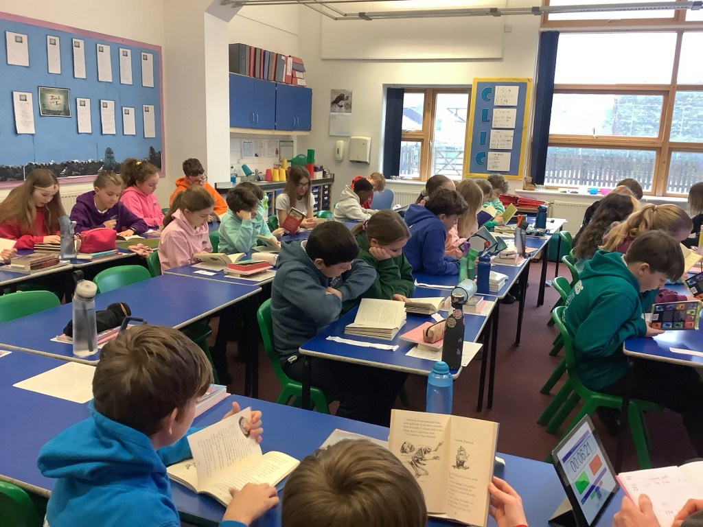This is Year 6 practising their reading this morning. We work in pairs so that everyone gets a turn. 20 + minutes of reading really helps the children to make progress. Please continue to read at home with your child. It will make a huge difference as they move up to secondary school.