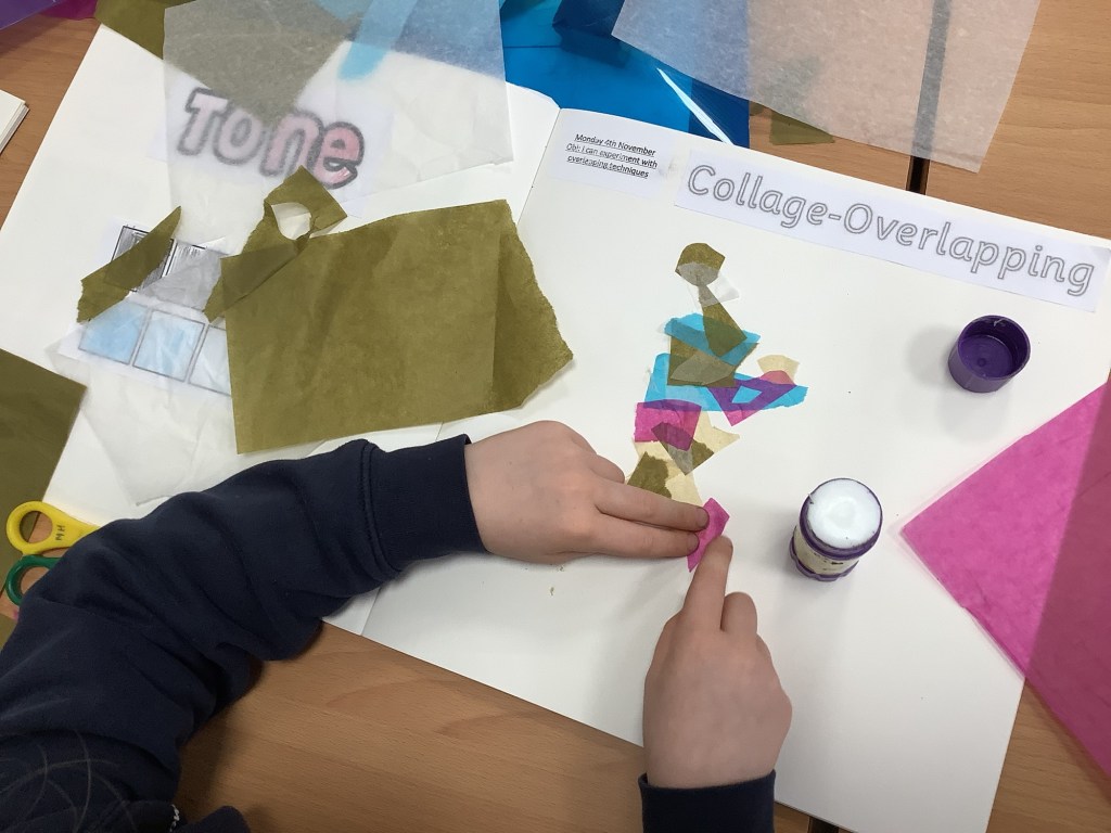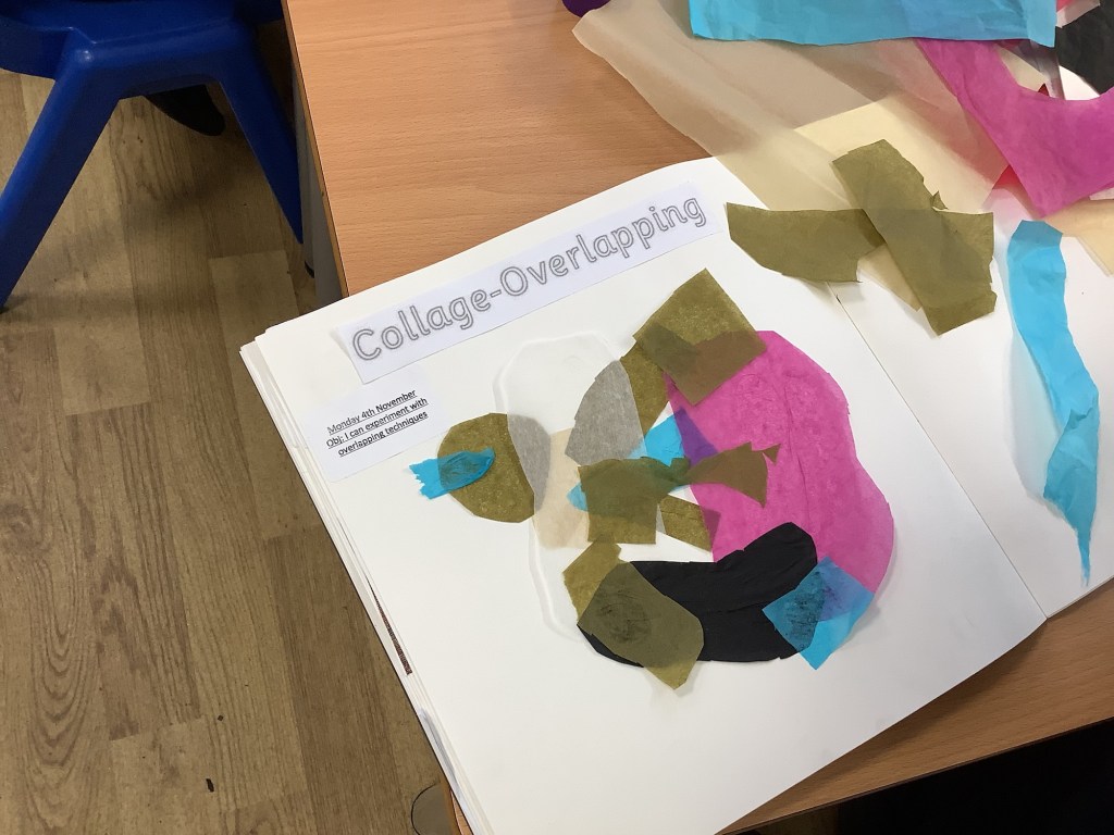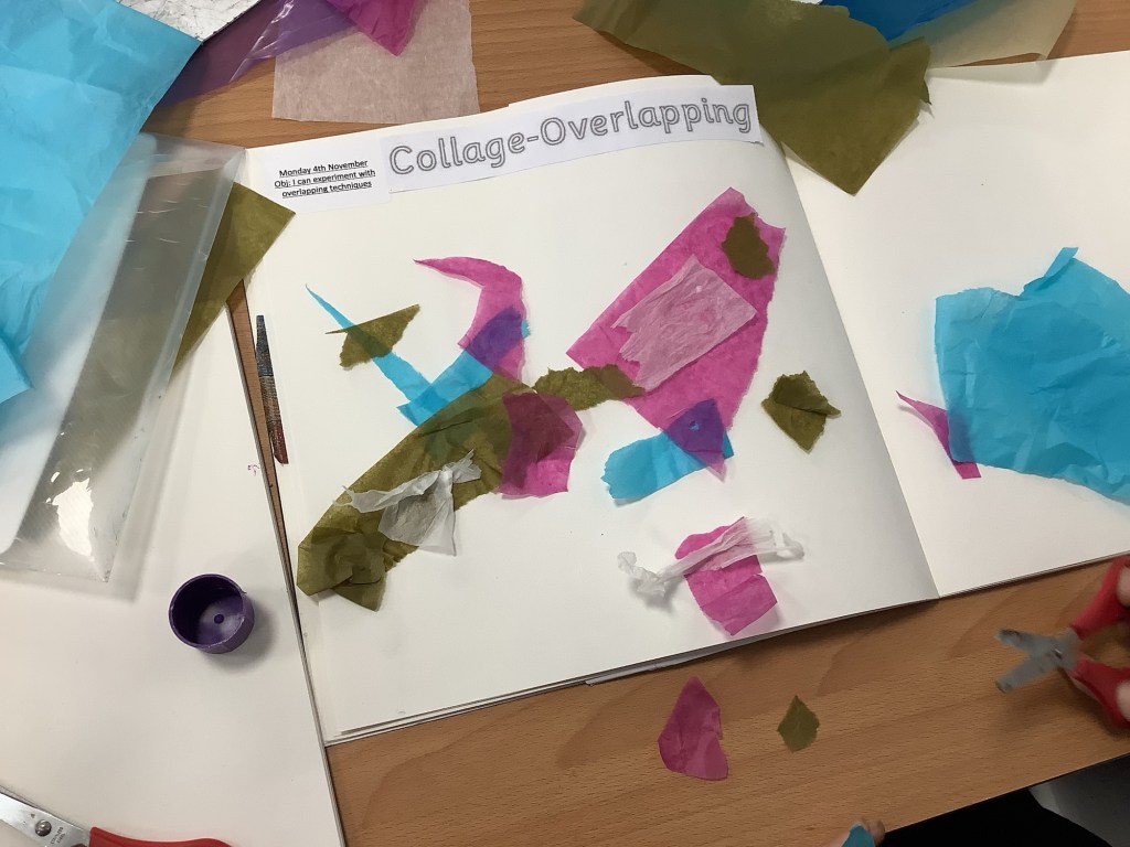 We started our collage unit today. We experimented with cutting and tearing tissue paper. Then we used the technique of ‘overlapping’ to create different effects.