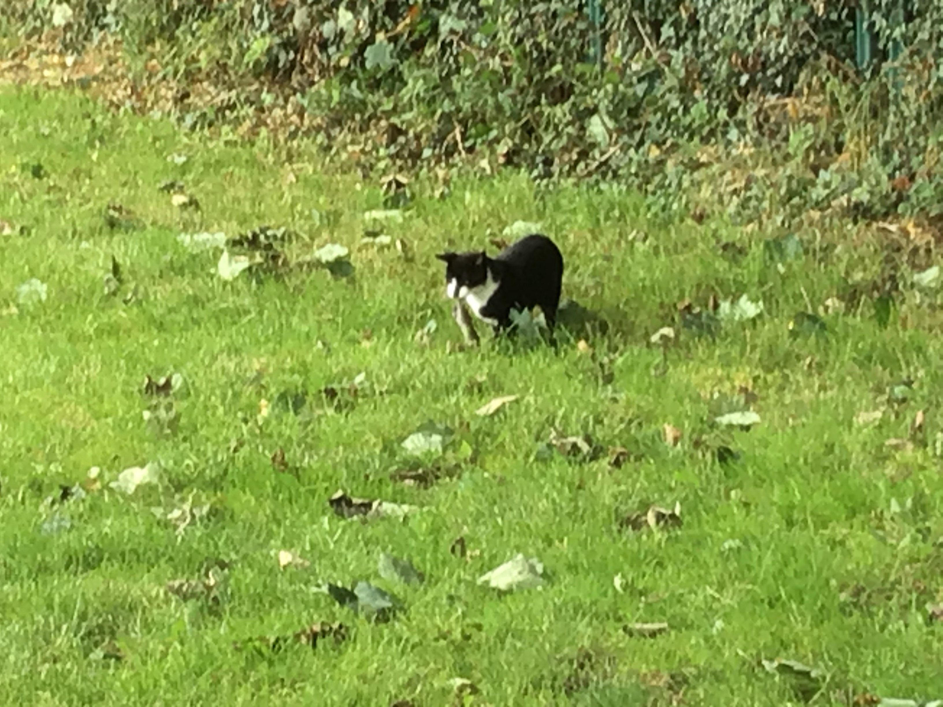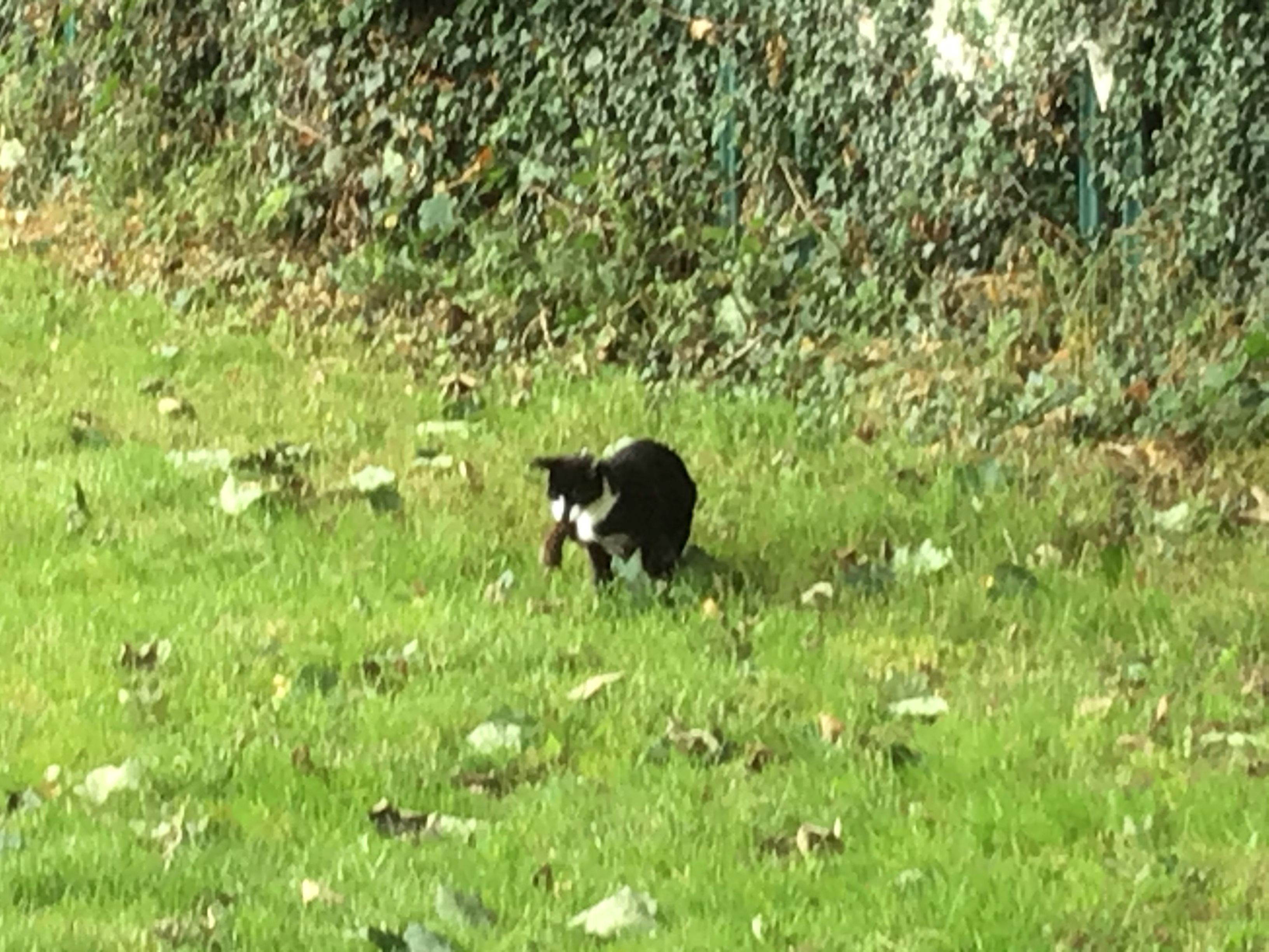 We played out on the grass this afternoon and we saw a cat with a mouse in its mouth!