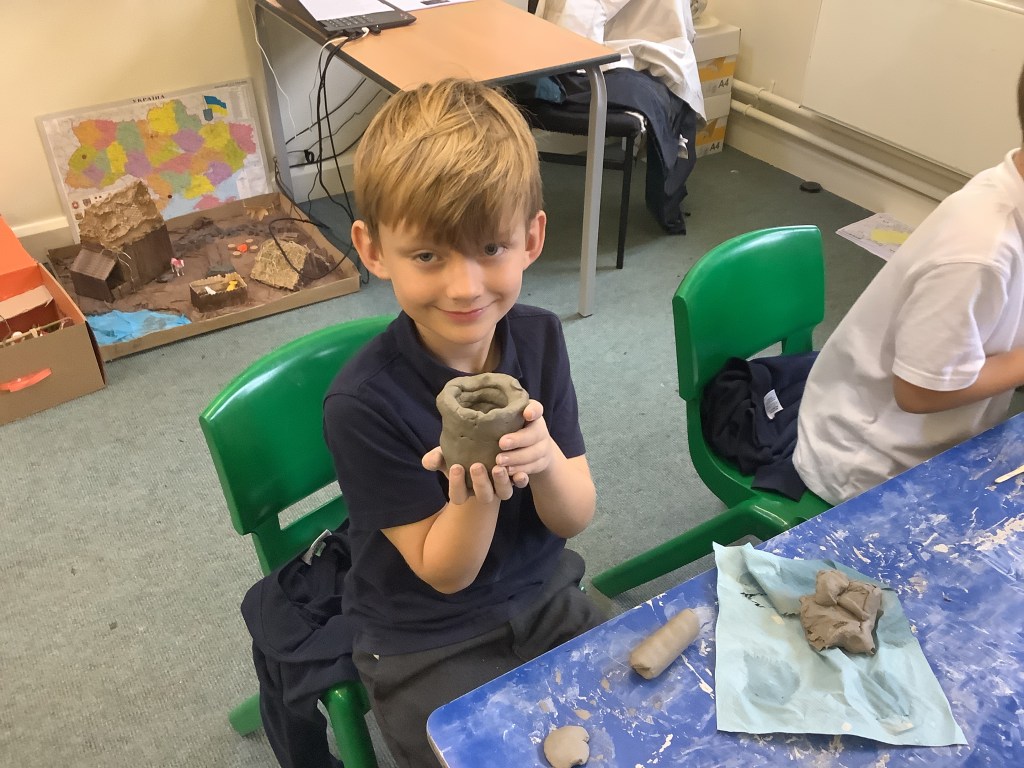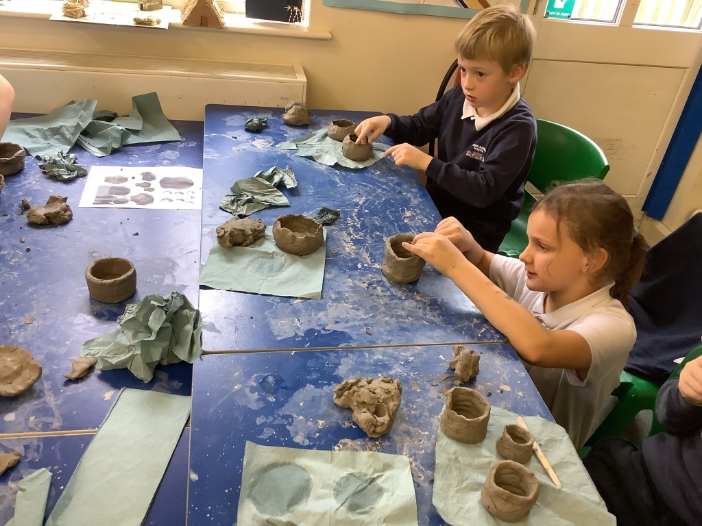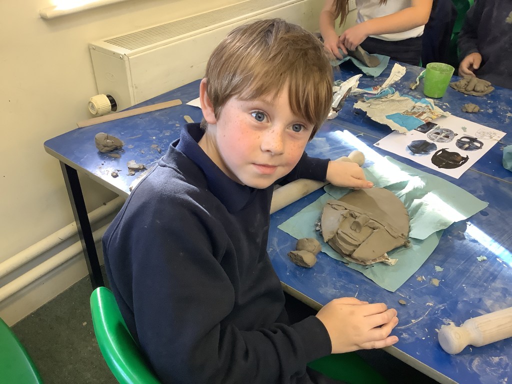 Year 4 had a super time with Mr Hill, making Anglo-Saxon clay pots and masks, like the one found at Sutton Hoo. It’s harder than it looks to make a really good pot or mask without getting a bit dirty. Well done, Year 4. True Anglo-Saxons!